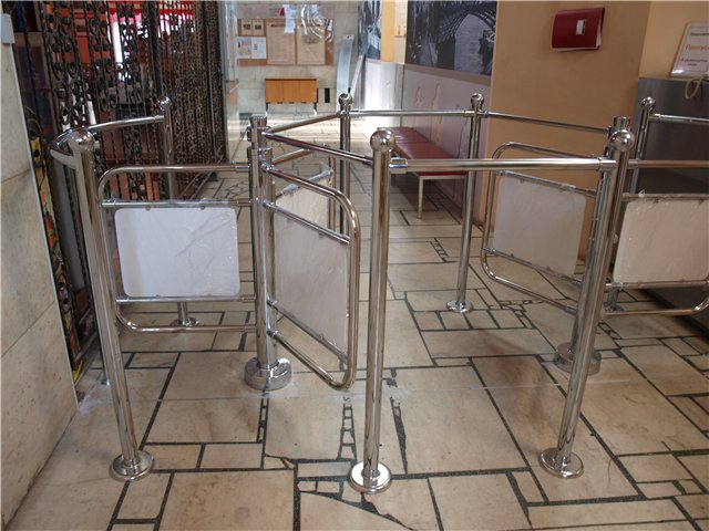 Таким образом с недавнего времени оборудован вход в Библиотеку Иностранной литературы. Для людей на инвалидных колясках вход невозможен - конструкция неразборная, а объехать её также не получится. Дамы-сотрудницы библиотеки извинялись передо мной - не их вина, установить эти контрэскарпы велело министерство культуры.