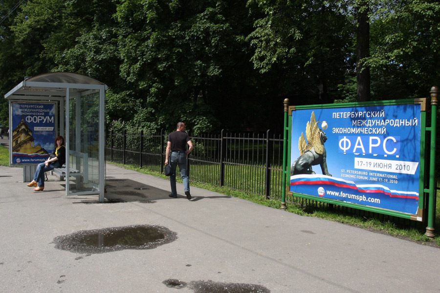 Активисты ДСПА выразили свое отношение к ежегодным посиделкам на Васильевском острове. Они просто немного изменили рекламные баннеры форума (в частности, на Большом проспекте Васильевского острова, который является основной дорогой на эти пафосные местечковые посиделки), чтобы расставить вещи на свои места.