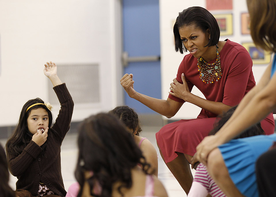 Первая леди США изображает здоровяка во время встречи з учениками начальной школы города Силвер Спринг, штат Мэриленд, которая прошлом году получила награду министерства здравоохранения США за наиболее здоровый образ жизни. (Фото: Pablo Martinez Monsivais/Associated Press)