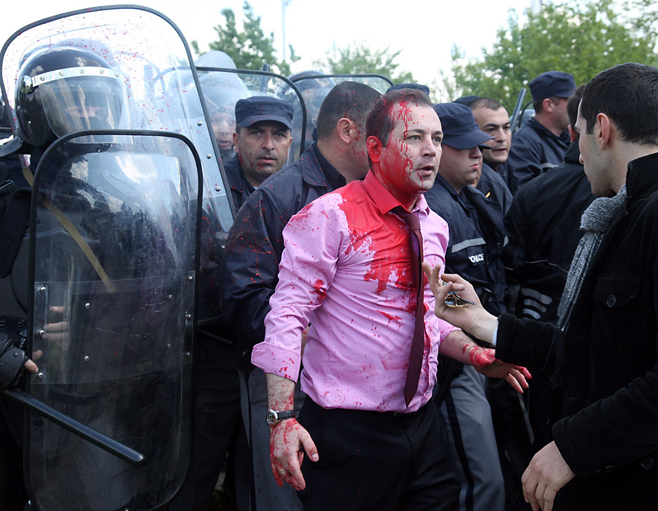 В Тбилиси прошел митинг оппозиции с требованием освободить политических заключенных, которых упрятал в тюрьмы Михаил Саакашвили. К счастью, митинг закончился не потасовкой, а только обливанием красной краской. (Фото: Zurab Kurtsikidze/European Pressphoto Agency)