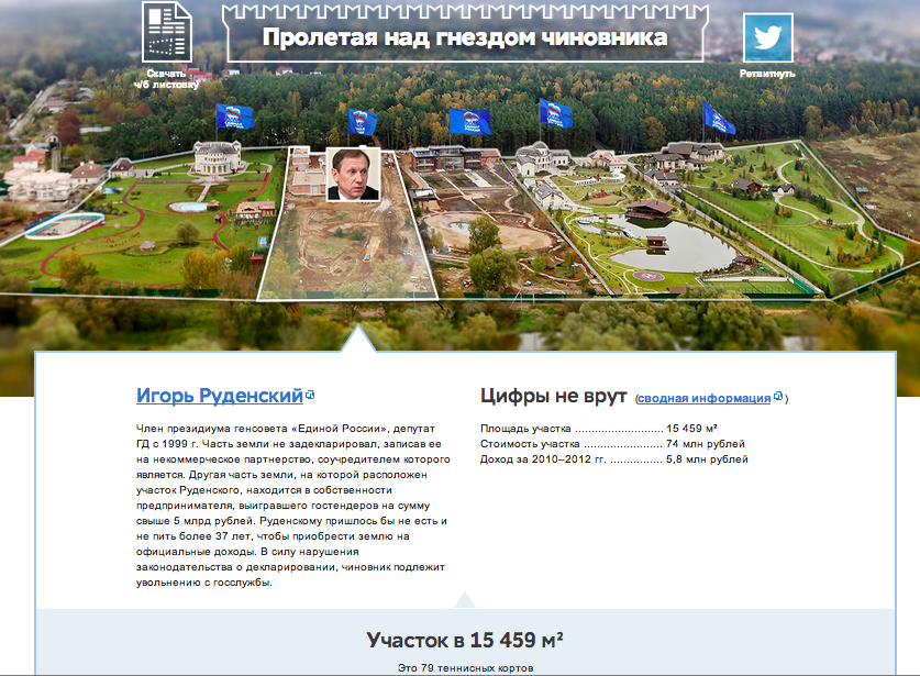 Честь, достоинство, деловую репутацию - всё это Руденский обнаружил у себя Это такая новая стратегия кремлешушеры, если раньше они делали вид, что не замечали наших расследований, то сейчас они бегут в суд, "судьи" под штамповку выносят решения в их пользу даже не разбираясь в деле, а шушерята используют "судебные решения" для блокировок сайтов. После того, как начнет действовать закон о запрете публиткации в блогах "данных о частной жизни" такая практика будет поставлена на поток. Так как в этом "суде" доказать ничего невозможно, да и не дают толком ничего сказать (кто был на таких заседаниях, тот знает), мы решили перед каждым заседанием делать подробный рассказ на тему "почему мы правы". Ваше мнение нам важнее, чем "судья", поэтому вам и доказываем, на вопросы отвечаем в комментах. Итак, Всё началось с того, что мы в ноябре 2013 года опубликовали расследование От дачного кооператива «Озеро» к дачному кооперативу «Сосны», где рассказали об очень непростых дачниках, которые не любят декларировать свои дворцово-парковые ансамбли. Естественно, речь идёт о высокопоставленных единоросах - Сергей Неверов (секретарь генерального совета партии «Единая Россия»), Игорь Руденский (председатель Комитета по экономической политике Госдумы), Николай Ашлапов (член «Единой России», начальник Федерального агентства специального строительства, заместитель министра регионального развития России), Сергей Приходько (вице-премьер и руководитель аппарата правительства) и Вячеслав Володин (первый заместитель руководителя администрации президента, член бюро высшего совета «Единой России»). Подробнее познакомиться с историей каждого можно вот по этой ссылке: http://dacha.fbk.info/