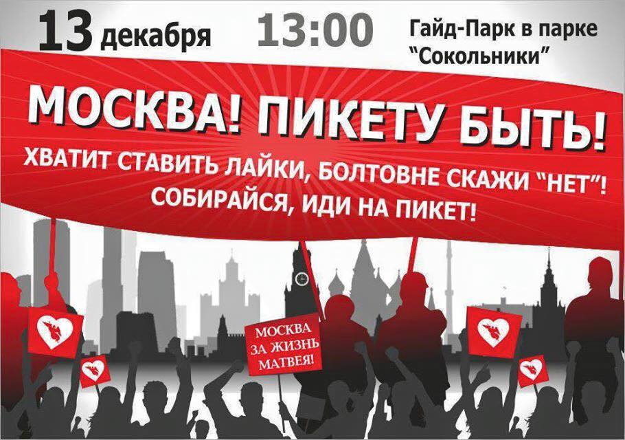 ![]() Время пришло!!! ПИКЕТАМ БЫТЬ!!! Мы долго бились, топтались на месте, обивали пороги, чтобы получить разрешения на высказывание своей гражданской позиции в отношении всего происходящего вокруг истории с обгоревшим малышом Матвеюшкой (), усыновлением принцессы Эли (петицияhttps://www.change.org/p/помогите-эле-оказаться-в-любящей-п…) , малышом Денисом (петицияhttps://www.change.org/p/переведите-дениску-из-больницы-в-с…), детишки, которые с рождения обречены на безразличие (петиция http://radostdetstva.livejournal.com/122519.html), смерть Умарали (петиция http://www.citizengo.org/…/30540-nakazat-vinovnyh-v-gibeli-…), смерть Гриши Юстус (материал http://www.n71.ru/news/section193/show45118/)!!!!! И это только маленькая часть того, что происходит каждый день в нашей огромной стране! Как в такой ситуации можно сидеть и МОЛЧАТЬ?! Делать вид, что НИЧЕГО не происходит?! Я лично не могу и не хочу! Ни молчать, ни делать вид, что ничего не случилось! Поэтому, Я ИДУ НА ПИКЕТ "ЗА ЖИЗНЬ И ЗДОРОВЬЕ НАШИХ ДЕТЕЙ"!!! Я хочу СЧАСТЛИВОЕ и ЗДОРОВОЕ детство для своих детей, для детей совей страны! И если ТЕБЕ, не всё равно, что происходит вокруг, Если ТЕБЕ не наплевать, какое будущее будет у ТВОИХ детей, Если, ТЫ, готов открыто об этом заявить, То приходи, МЫ тебя ЖДЕМ!!! ХВАТИТ СТАВИТЬ ЛАЙКИ! СКАЖИ БОЛТОВНЕ "НЕТ", СОБИРАЙСЯ, ИДИ НА ПИКЕТ!! Москва: 13.12 в 13:00, Гайд-Парк в парке "Сокольники", схема прилагается. Санкт-Петербург: 13.12 в 13:00, Марсово Поле Казань: 13.12 в 13:00, площадь у памятника Вахитова Воронеж: 13.12 в 14:00, Дом Офицеров, около памятника М. Пятницкому Красноярск: 13.12 в 13:00, сквер Космонавтов Тула: 14.12 в 17:30,ул. Октябрьская д.304, перед ТЦ "Пенаты" |