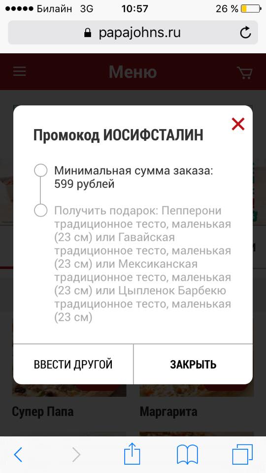Пиццерия Папа Джонс ввела промокод ИОСИФСТАЛИН. Дарит за имя диктатора гавайскую пиццу или пепперони. Серьезно. Я не шучу. Мой репрессированный прадед Алексей Сомов, чья единственная вина состояла в том, что он был инженером по образованию и построил электрическую мельницу (её признали буржуазным излишком и взорвали), и я передаём этим больным ублюдкам пламенный привет |