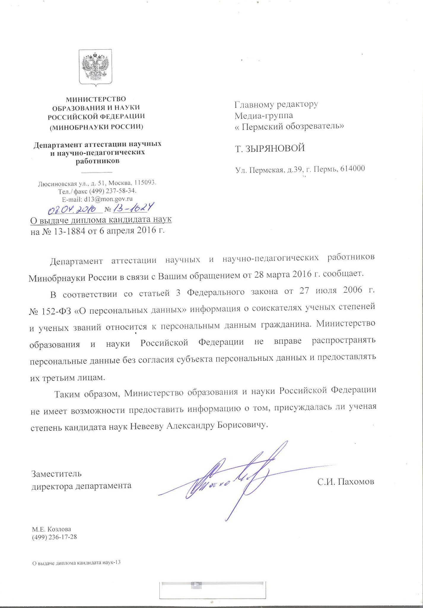 | Каким образом можно судить о времени, в котором мы живем? Можно судить по приметам, по случайным знакам, по отголоскам скрываемых событий. Но чаще всего суждение рождается из непоняток, из когнитивного диссонанса, если хотите. Одна из непоняток пришла письмом из города Перми, где "Счастье не за горами". На простой вопрос, является ли "местный жулик" (воспринимать в качестве фигуры речи, т.к., оказалось, что не местный, и, м.б., даже не жулик, но сути дела это не меняет), дипломированным ученым, Министерство образования и науки отвечает: это государственная тайна, охраняемая законом о персональных данных. ![]() |