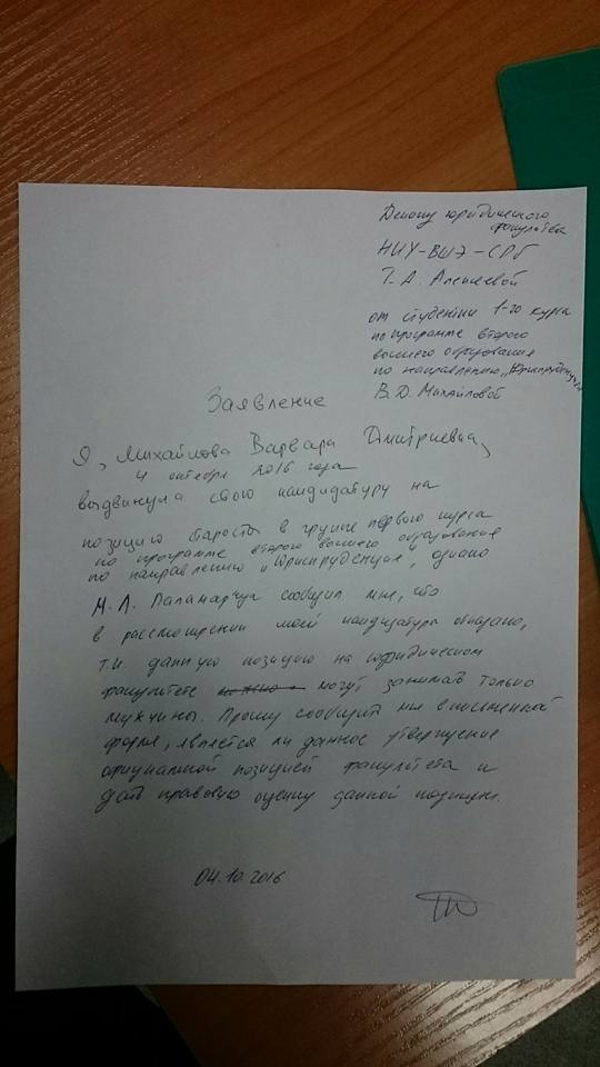 ![]() Последний месяц я провела в восторженном ожидании первого учебного дня в питерской Вышке, вспоминая шуточки и смешные картинки, которыми я проиллюстрирую своё юридическоё будущее, посвящённое борьбе за права женщин в России. Но жизнь была бы недостаточно кинематографичной, если бы с сексизмом на самом официальном уровне я бы не столкнулась на первом же занятии в Высшей школе экономике. Перед первой парой с нами провёл беседу менеджер юридического факультета Максим Леонидович Паламарчук, который рассказал нам о всяких техничеких деталях учебного процесса и предложил тем, кто хочет быть старостой, выдвинуть свои кандидатуры. – Тут есть единственное ограничение, – сказал Максим Леонидович, – по традиции старостами у нас могут быть только мужчины. Я так обалдела, что даже проглотила язык. Но удивилась не я одна. – А есть какая-то история, которая связана с этой традицией? – спросила другая девушка. Максим Леонидович пробурчал что-то в духе того, что сейчас нет времени это обсуждать. – А как вы лично относитесь к этой традиции? – единственное, что смогла выдавить я. – Я не даю оценок, – ответил дипломатичный Максим Леонидович. И тут же записал единственного высказавшего желание мужчину в потенциальные старосты. – Окончательно решим в субботу, – радостно объявил Максим Леонидович и перешёл на другую тему. Я немного пришла в себя и снова подняла руку. – Я пришла сюда получать юридическое образование, и чего я никак не ожидала здесь увидеть, так это гендерной дискриминации, которая, как вы знаете, запрещена нашей конституцией. Я выдвигаю свою кандидатуру на роль старосты и, если она не будет рассмотрена, прошу дать мне письменный ответ о том, что она не была рассмотрена из-за моей половой принадлежности. Максим Леонидович очаровательно улыбнулся и удалился в свой кабинет. Всю пару я не могла сосредоточиться и поверить в происходящее. Однако знакомые по Вышке написали, что традиция про половую принадлежность старосты действительно существует и относится не ко всей Вышке, а исключительно к юрфаку. В перерыве я отправилась в учебную часть. – Максим Леонидович, я к вам. – Если вы о выдвижении на роль старосты, то я обсудил вашу идею с руководством: ваша кандидатура отклонена. По причине, которую я вам уже озвучил. – Это официальная позиция факультета? Ваши преподаватели-юристы знают о том, что у вас тут происходит? – Все знают. И все прекрасно к этому относятся! – В таком случае я повторяю своё требование предоставить мне обоснование отклонения моей кандидатуры в письменном виде. Максим Леонидович немного попересаживал меня от стола к столу, предложил «поискать на сайте бланк», потом торжественно сообщил, что мог бы распечатать мне бланк, но не будет это делать, потому что «это не принято», и в итоге предложил переписать шапку с экрана своего компьютера. Я написала заявление («...прошу сообщить мне в письменной форме, является ли данное утверждение официальной позицией факультета, и дать правовую оценку данной позиции...») и попросила зарегистрировать его и выдать мне заверенную копию. – А у нас ведь есть позиция заместителя старосты, вы могли бы занять её, – Максим Леонидович, видимо, испугался, что я не шутила, когда говорила о заявлении, и решил предложить мне сделку. – Меня не интересует позиция старосты. Меня интересуют права же