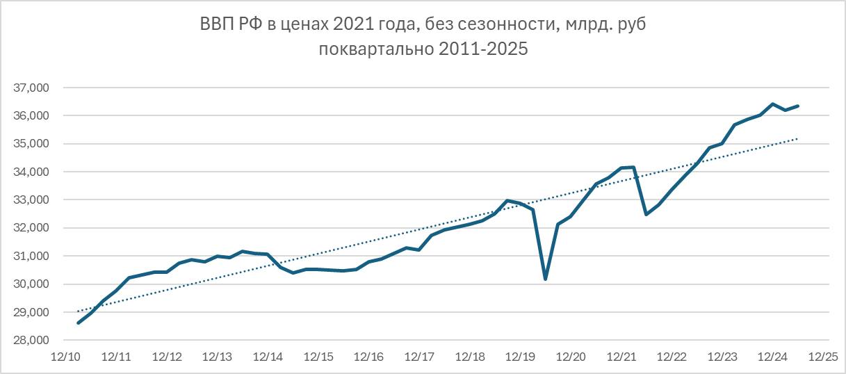 Сначала произошло падение ниже долгосрочного тренда экономического роста, потом отскок выше него. Такими темпами российская экономика долго расти просто не может, она даже на этой более высокой траектории долго находиться бы не смогла, так что, то, что наблюдается сейчас – это во многом просто возврат к тренду.