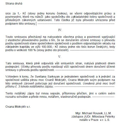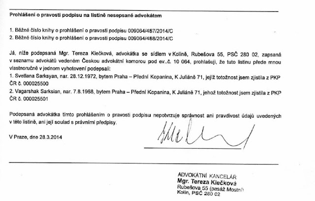 В документе говорится, что “Я, Тереза Клечкова, адвокат в г.Колин, зарегистрированная в Чешской адвокатской палате под номером 10 064, я заявляю, что этот документ перед мной в одном экземпляре подписан: