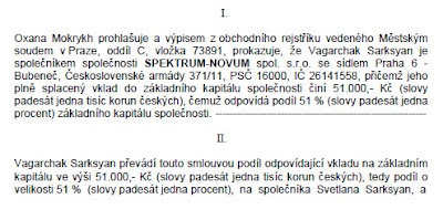 Сразу после нашего обращения в прокуратуру, в конце мая Сарксян передает свою долю в s.r.o. бывшей жене (с 2014 года она не фигурирует в его декларации о доходах). Просматривая документы чешской фирмы, мы обнаружили крайне примечательный факт: депутат Вагаршак Сарксян не только ведет бизнес в Чехии, но и имеет там вид на жительство. Это указывается в учредительных документах от апреля 2014 года: