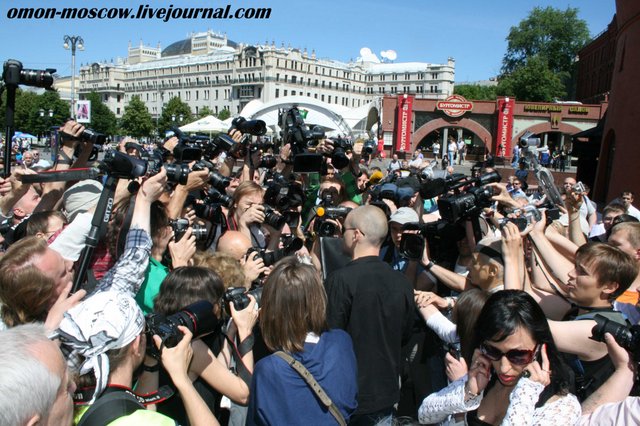 Приехал к 13.40.Стою жду со стороны Большого Театра.Со мной рядом 2 молодых парня оператора из "РОССИИ" сидят на каменной скамейке у фонтана,рядом с остановкой телекомпания "Мир".Фотографов очень мало.Фоткаю ментов и ОМОН,которые находятся у памятника К.Марксу.В сквере у памятника менты в парадке,чуть далее солдаты-срочники вроде.Где то в 13.58 к ментам присоединяются дружинники толтообрюзжего вида,человек 5.Болтают с ментом у забора.У мента матюгальник.Ничего не происходит.Проносится полицейский кортеж,а за ним поливальные машины.14.15.У К.Маркса менты,солдатаы,ОМОН в автобусах.Все тихо,еду домой.