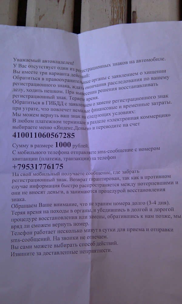Телеведущая Татьяна Лазарева рассказала в микроблоге о новой "креативной", по ее мнению, разводке для автомобилистов. Лазарева выложила фотографию письма, в котором мошенники предлагают автовладельцу заплатить за возвращение регистрационного знака на автомобиле. |