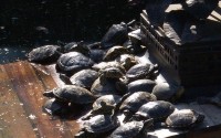 Черепахи устроены по-другому, и общаться желают только с себе подобными. Весной их было 15 штук. Сейчас — пятьдесят. Возможно и 60, поскольку в момент подсчета не все были на помосте. Они, понятное дело, не из воздуха материализуются и не размножаются. Их кто-то приносит. Этот или эти загадочные «кто-то» ни разу не были застигнуты за этим занятием.