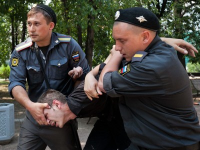 | ОМОН разгоняет сидящих в сквере на Лубянской площади (Источник) |