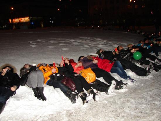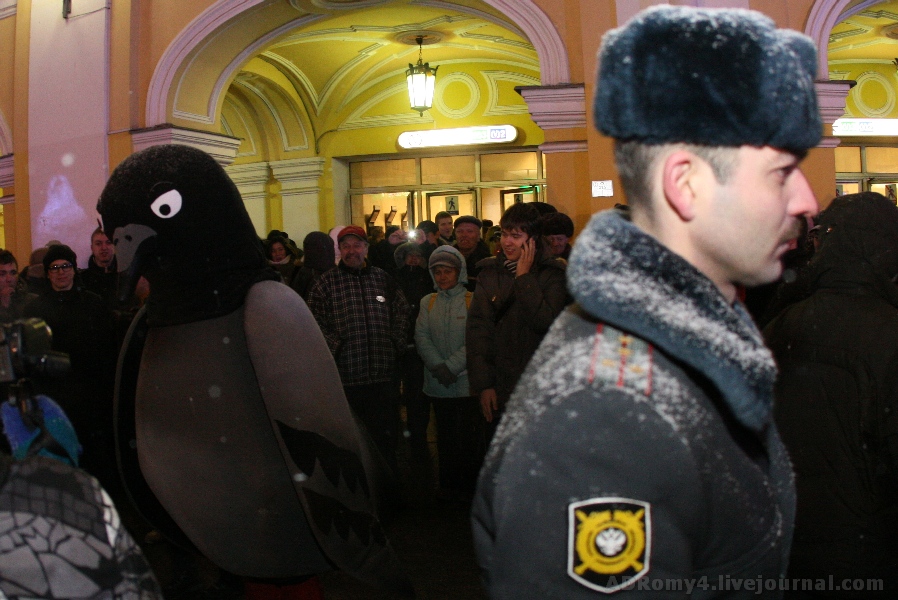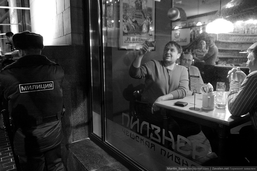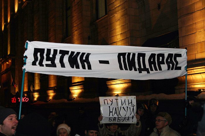31 января 2011 года, вечер, Москва, Триумфальная площадь. На снимке: перед рамками металлодетекторов у входа на согласованный с московскими властями митинг "Стратегии-31" протестующие держат транспарант с сообщением о том, что председатель правительства Российской Федерации Владимир Владимирович Путин - пидарас.
