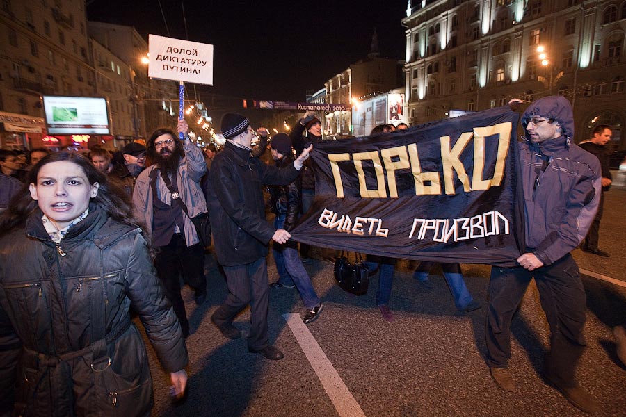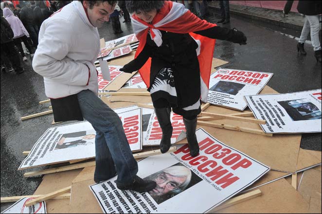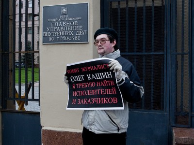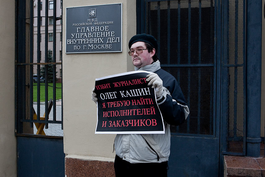 Москва, Петровка, 38. Несколько гражданских активистов и журналистов проводят сейчас у здания ГУВД одиночные пикеты с требованием найти и наказать тех, кто избил сегодня ночью журналиста «Ъ» Олега Кашина.