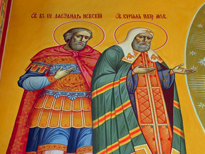Надвратная фреска внутреннего убранства алтаря храма Феодоровского монастыря в Городце сначала была оформленна вот так. Но иконописцу указали на неточности. Он покаялся и признал ошибку. Из "объяснений" следует, что: сначала хотели изобразить митр. Кирилла Киевского; потом решили изобразить св. Даниила Московского; но изобразили все-таки "неканонизированного" (по мнению иконописца) митр. Кирилла в патриаршем облачении с нимбом