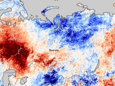 Тёмно-красным отмечены регионы, где температура как минимум на 12°С превышает норму, тёмно-синим — где на 12°С ниже обычного.