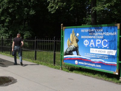 Активисты ДСПА выразили свое отношение к ежегодным посиделкам на Васильевском острове. Они просто немного изменили рекламные баннеры форума (в частности, на Большом проспекте Васильевского острова, который является основной дорогой на эти пафосные местечковые посиделки), чтобы расставить вещи на свои места.