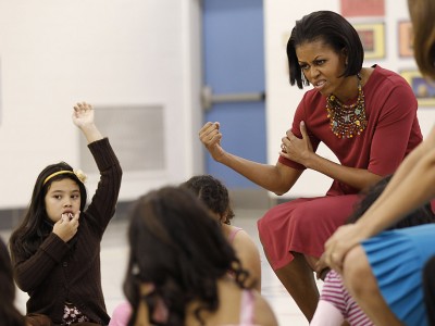 Первая леди США изображает здоровяка во время встречи з учениками начальной школы города Силвер Спринг, штат Мэриленд, которая прошлом году получила награду министерства здравоохранения США за наиболее здоровый образ жизни. (Фото: Pablo Martinez Monsivais/Associated Press)