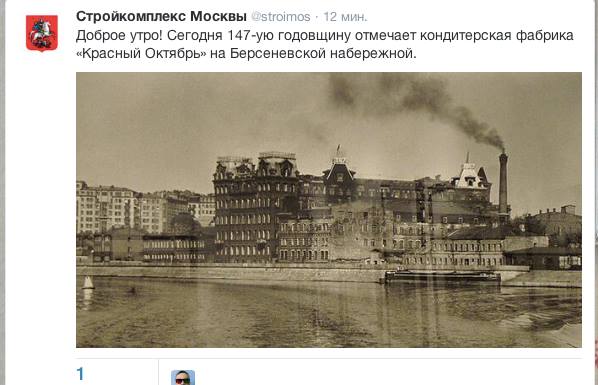 Твиттер "Строительный комплекс Москвы" сообщает нам сегодня о славной годовщине "Красного Октября". Видимо, москвичи не допущены к работе в строительном комплексе Москвы, иначе там бы знали про фабрику «Эйнемъ». Было бы странно, если б Теодор Фердинанд фон Эйнем назвал в 1851 году своё детище "Красный Октябрь". За 66 лет до того самого октября.