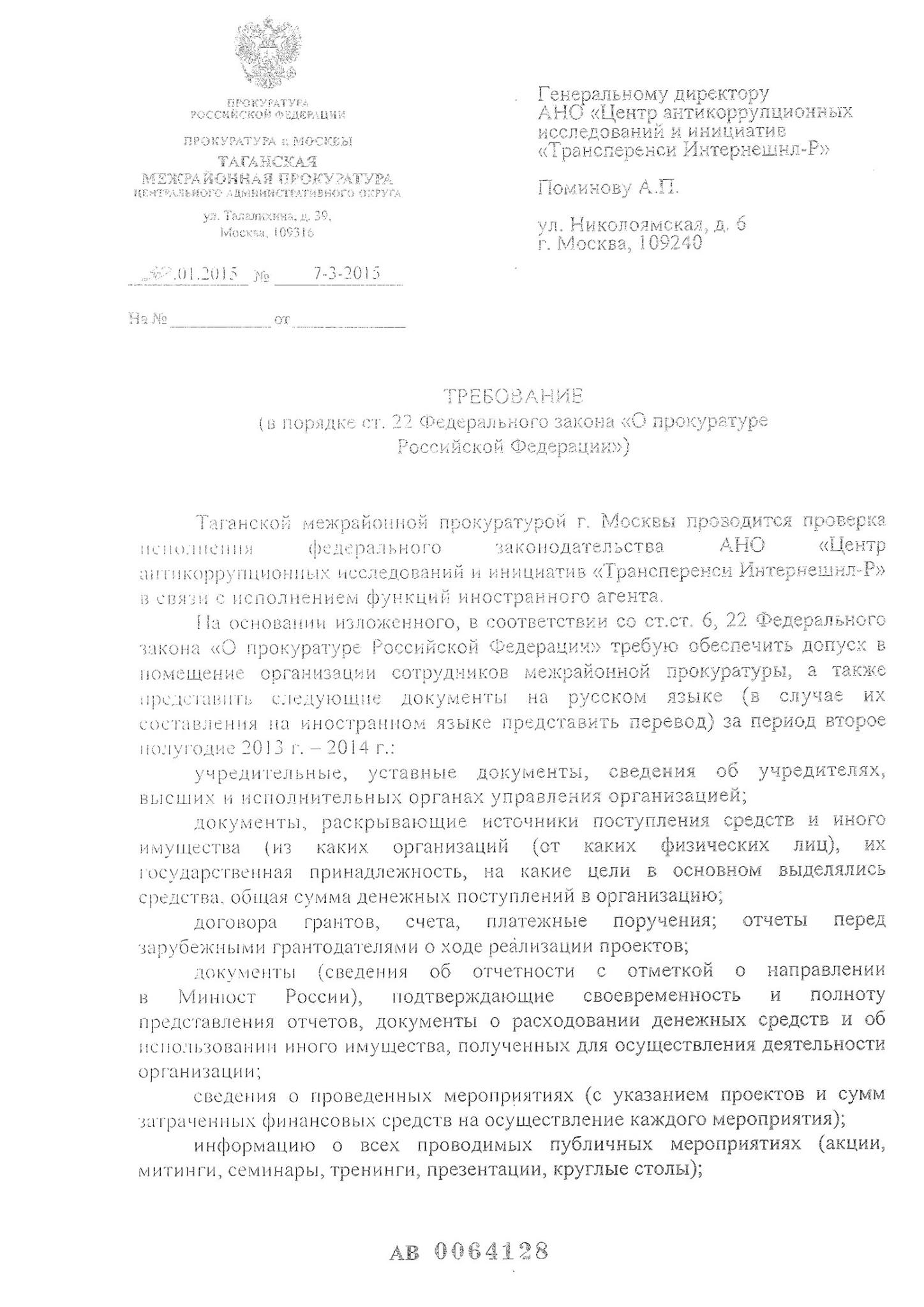 Сегодня в наш полупустой офис (немалая часть сотрудников находится на нашей Зимней школе) пришли прокуроры. Они вручили нам требование о предоставлении ряда документов до 2 февраля, то есть до понедельника. Требование связано с проведением проверки по исполнению функции иностранного агента. Прокуратуру интересуют наши уставные документы, договоры с донорами, бумаги, подтверждающие расходование средств, сведения о проведенных мероприятиях, о публикациях в СМИ и выступлении в теле- и радиопередачах. Кроме того, нам предписано предоставить на русском языке отчеты, которые мы передаем грантодателям. Учитывая, что мы их предоставляем в Секретариат Transparency International в том числе и на английском, от нас требуется до понедельника перевести более пятисот страниц текста. Следите за новостями.