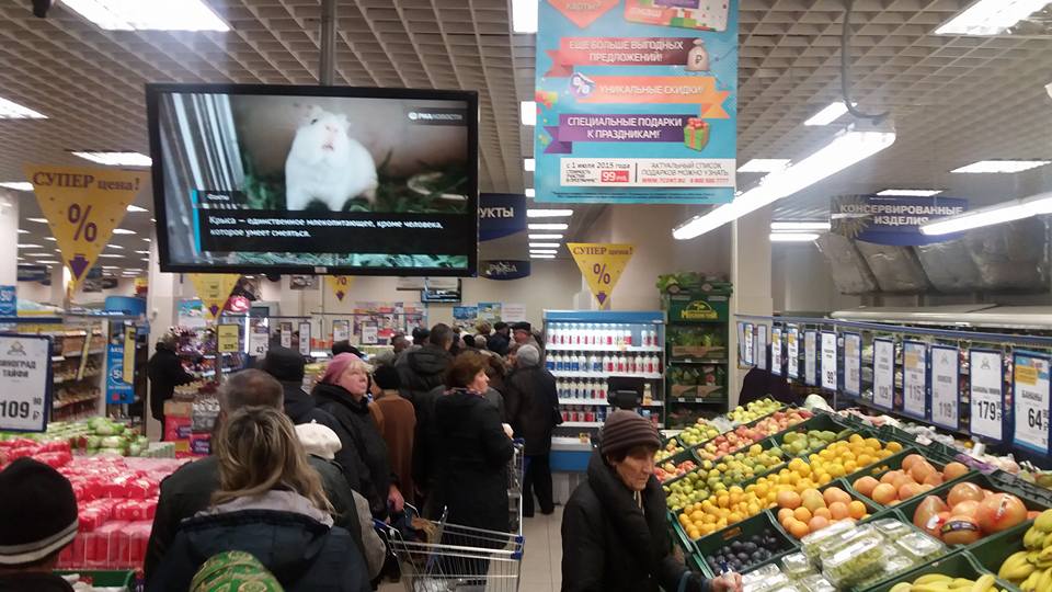 Зашел в "Седьмой континент" по соседству. Уже от входа начинается огромная очередь, очень давно таких не видел. В очереди,в основном, пенсионеры, но есть и вполне хорошо одетые граждане с детьми, все возбужденно переговариваются:"сейчас вынесут!".