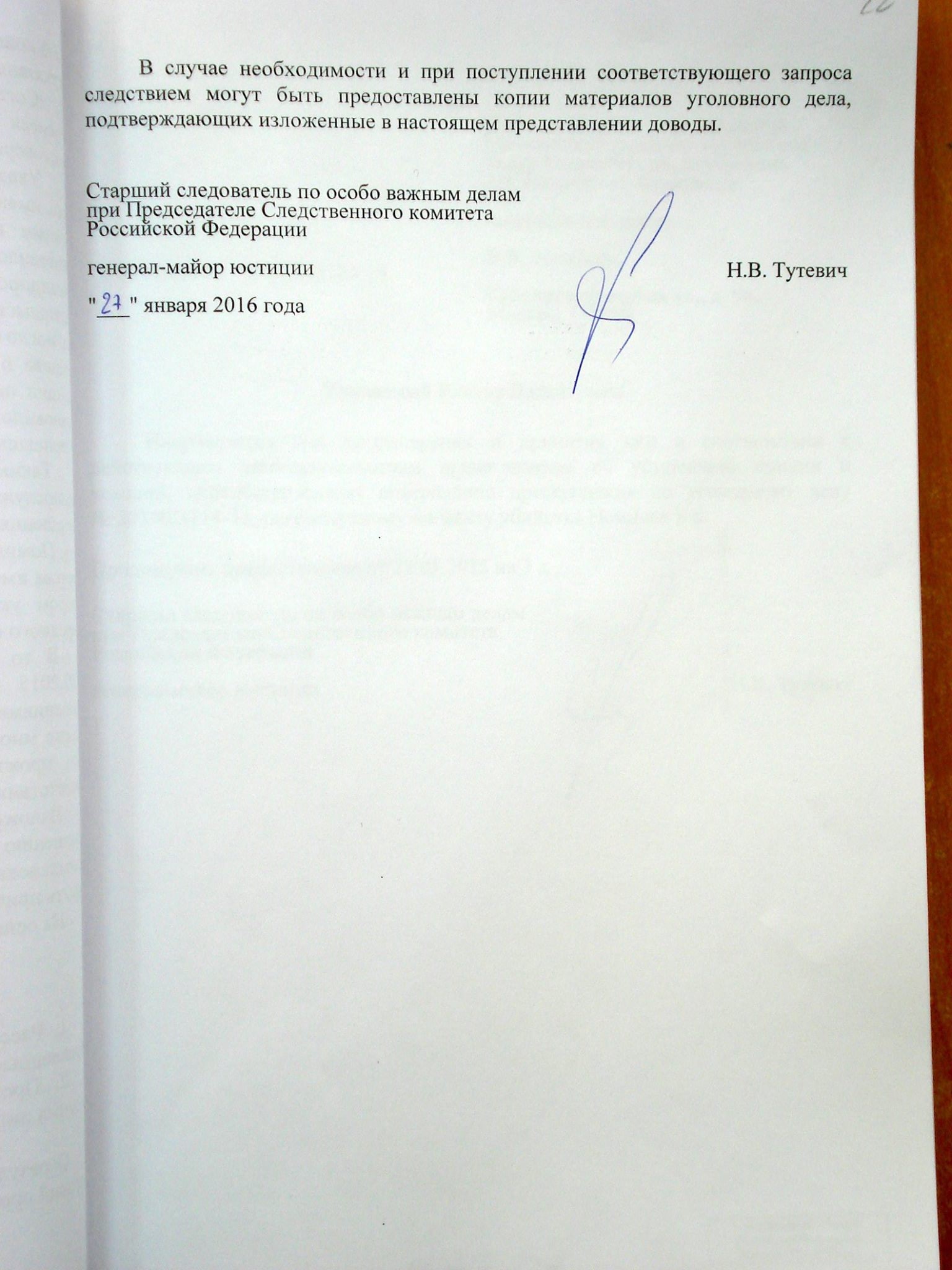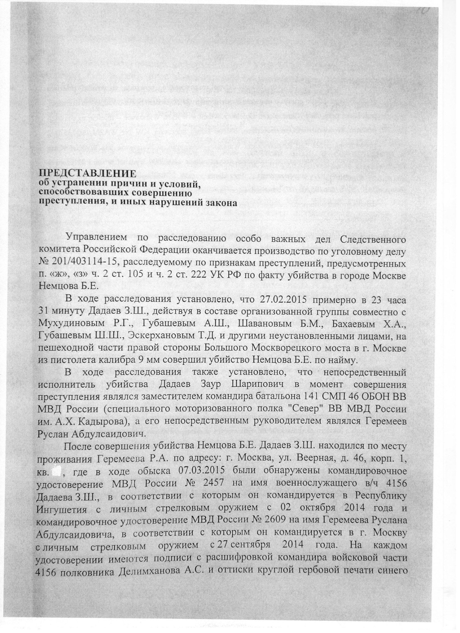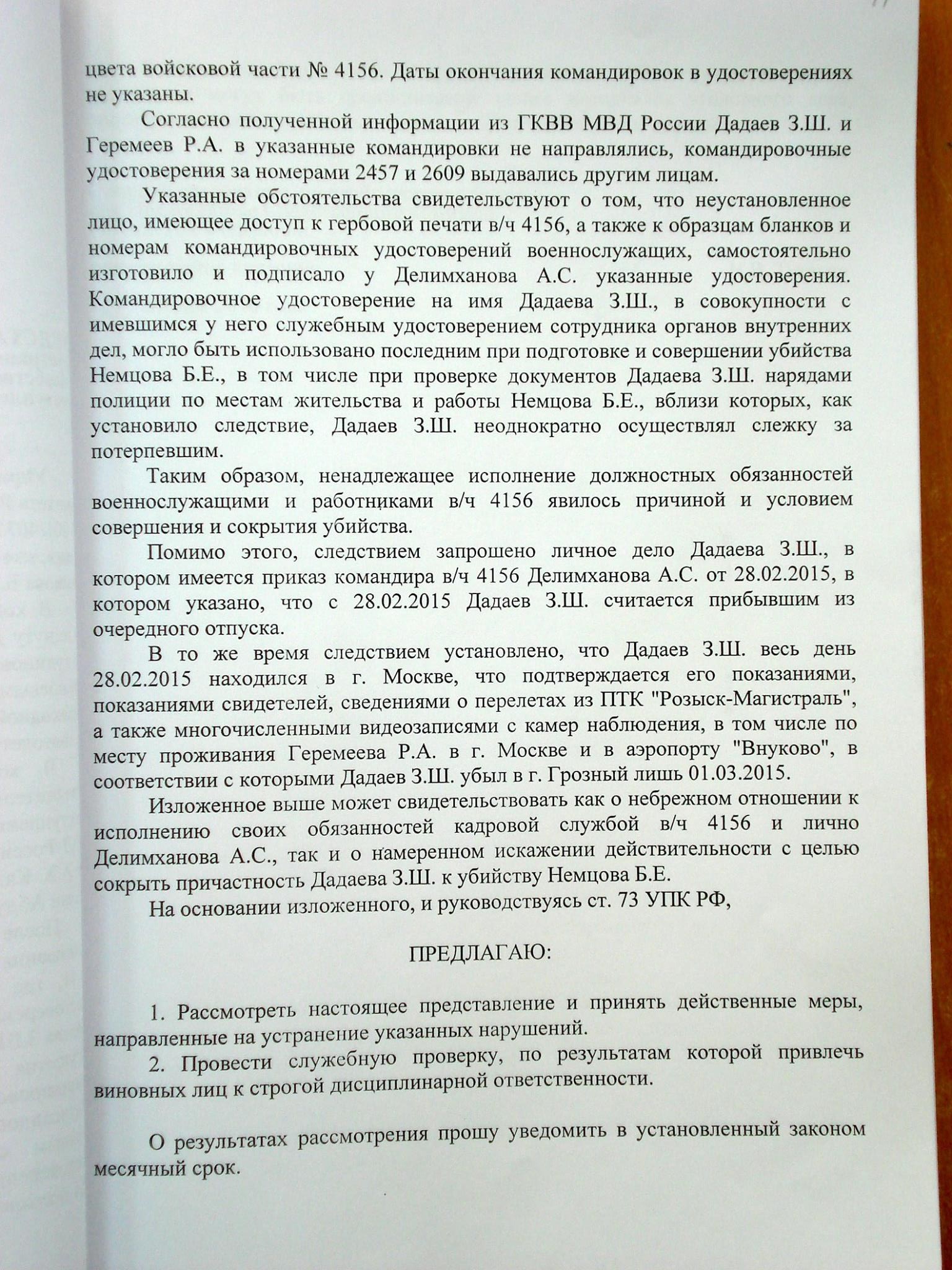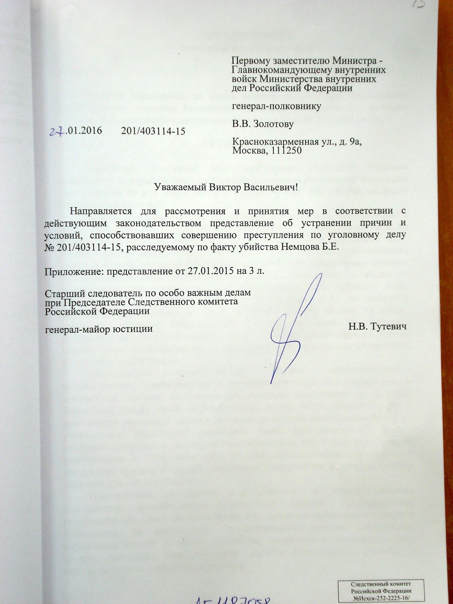 Что нужно делать, чтобы даже не самое активное следствие вышло с таким Представлением об устранении причин и условий, способствовавших совершению преступления, и иных нарушений закона! Оказывается, в момент совершения убийства Бориса Немцова злодеи официально находились в командировках с действующими командировочными удостоверениями МВД России и с табельным оружием! В данном Представлении генерал Тутевич требует от Золотова «провести служебную проверку, по результатам которой привлечь виновных лиц к строгой дисциплинарной ответственности». В частности, в данном Представлении Золотову указано: Жаль только, что, исходя из своего теплого места в околопутинской иерархии, «главный гвардеец» в данный момент не только не пойдет на допрос (если сам, конечно, не захочет или если «старший» не прикажет), но и пошлёт Следственный комитет куда подальше с его Представлением вместе со всеми его генералами и лично с путинским приятелем Бастрыкиным… |