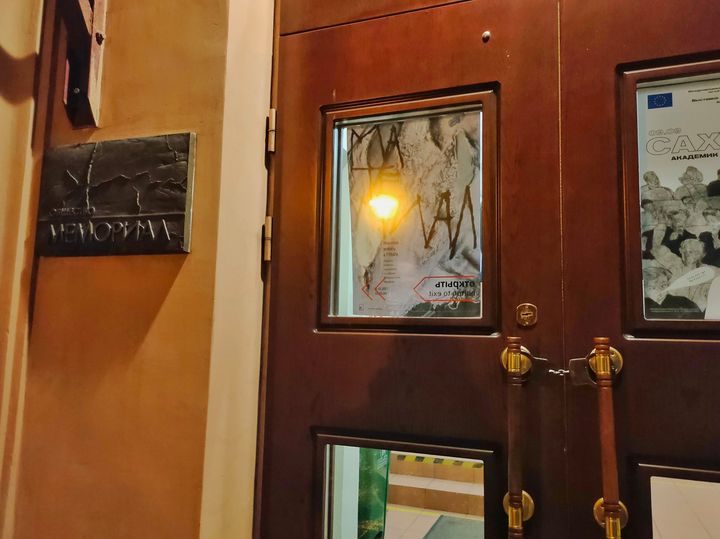 Затем они закрыли и вход - и при этом невзначай создали эпохальную инсталляцию, заблокировав дверь в "Мемориал" наручниками. Получился отличный образ времени, в котором мы живем.