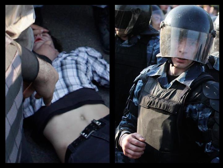 Этому парню (слева) этот сотрудник ОМОН (справа) сегодня целенаправленно зарядил со всей силы кулаком в голову, после чего парень упал мне в ноги и не подавал признаков жизни. Это был не случайный удар. В каком-то бешенстве этот сотрудник, когда его строй уже отходил от скопления протестующих, подлетел к парню и вдарил. Мальчика омоновцы быстро унесли на руках к карете скорой помощи. Что с ним? Жив? |