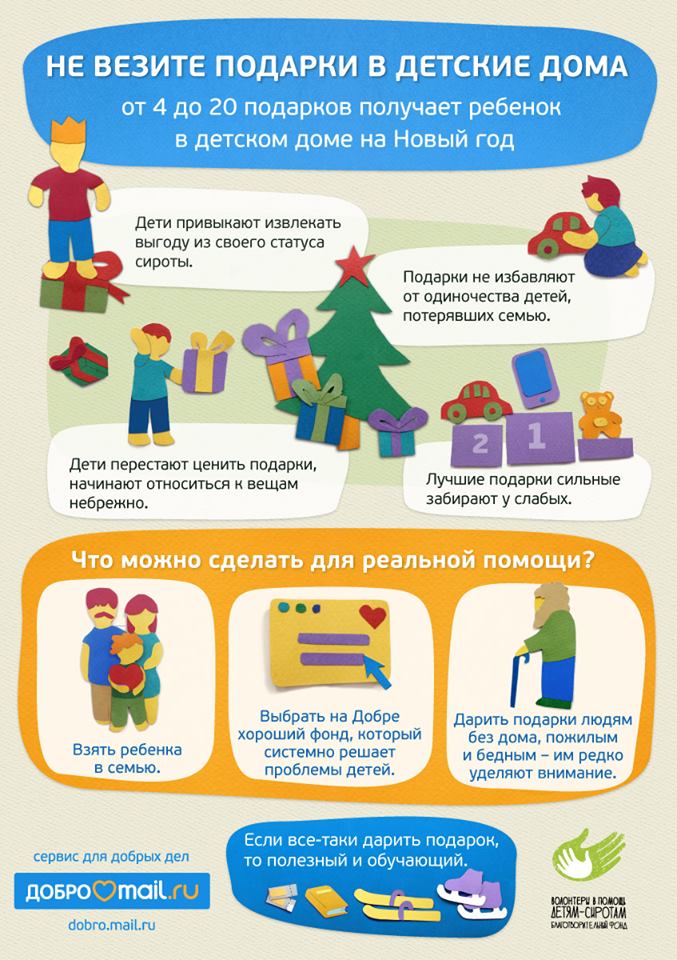 Дорогие коллеги по сфере КСО. Давайте это будет часть этикета, давайте мы будем резко обрывать тех, кто говорит об этом (пусть даже не очень вежливо). Давайте уже раз и навсегда поймем, что это - плохо. Это неприлично, Давайте не будем лукавить, что не знаем фондов, которые помогают детям-сиротам правильно - социализироваться, становиться самостоятельными, находить родителей, не быть отнятыми из родной семьи в детcкий дом. Я очень хочу, чтобы однажды эта инфографика перестала быть актуальной. Помочь правильно можно здесь. https://dobro.mail.ru/projects/net-nazvaniya/
