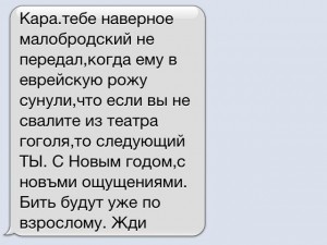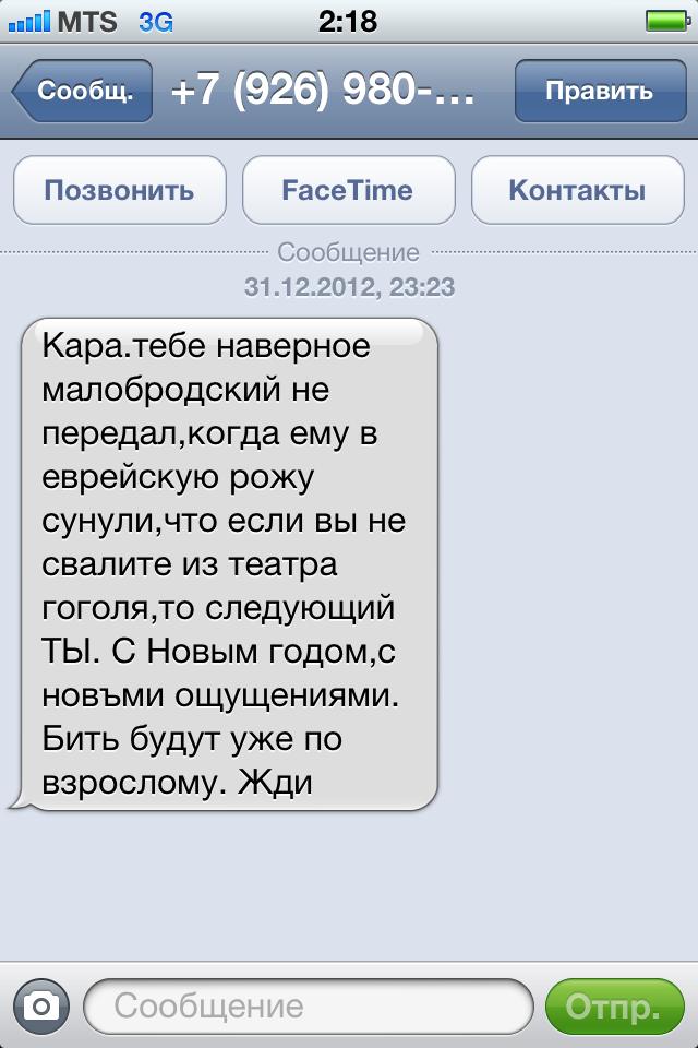 И еще ...в контексте происшедшего с Сережей Филиным. Мне давно шлют угрозы. Давно и много. И мне шлют, и Алексею Малобродскому, директору Гоголь-центра. Сегодня стало известно, что материалы переданы в правоохранительные органы и расследование начато. Ждите, гниды..