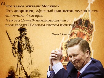 Сергей Иванов, глава администрации президента: "Кто такие жители Москвы? Это дворники, водители, офисный планктон, журналисты... в крайнем случае, блогеры... Что эта 15 - 20 миллионная масса производит? Ровным счетом ничего. Интеллектуальную собственность? Вопрос сомнительный... Что производят в Москве, я не понимаю". - Уфф... Конец цитаты.
