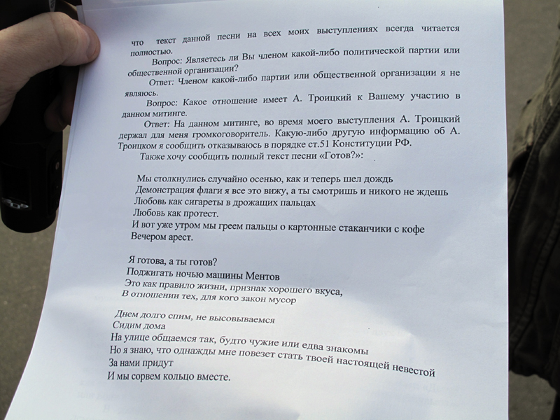 Если ты читаешь стихотворение на пятитысячную толпу в кольце омона: "Я готова - а ты готов? Поджигать машины ментов" - то ты не можешь не понимать, что это будет восприниматься как провокация. Когда я пою рок-н-ролл "Полетели, Путин!" я например понимаю, что мы шутим над властью - а у нее судя по всему не все в поряде с юмором. Так вот стихотворение про "поджигать машины ментов" в контексте Пушки - конечно поэтическая провокация - и делать вид что это просто стишок про лютики странно. Особенно если акция ЭКОЛОГИЧЕСКАЯ и все накалено до предела. Другое дело что ПРОВОКАЦИЯ - это важная составляющая современного искусства, а менты в искусстве, как доказано у нас в стране неоднократно, не шарят. По сему не будем делать круглые глаза и "не понимать" по какой такой причине на нас напряглись менты, но будем продолжать писать, петь и рисовать то, что считаем нужным - ибо это единственное бесспорное право художника во всем мире!