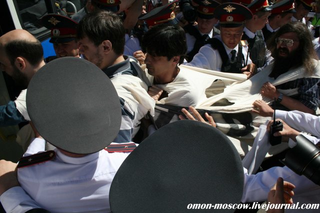 Сегодняшний День Гнева впервые в жизни для меня закончился, не начавшись - кто-то, может, и погневался, но не я. Я сильно опаздывала и только садилась в метро, когда позвонил френд Зайчег и сообщил, что на выходе из метро "Театральная" всех уже упаковывают, и можно, в общем, уже не приезжать. Я, тем не менее, доехала и увидела на выходе столпотворение вавилонское и ОМОНовцев, уминавших каких-то старушек и семейные парочки с детьми обратно в метро. Некоторые бабушки типажно напоминали участниц Дня Гнева, а некоторые, с тележками и кошёлками, выглядели совсем партикулярно, но их тоже не выпускали. Стоял шум-гам, при мне сквозь оцепление пропустили какого-то красномордого типа в белой рубашке и галстуке (о таких обычно говорят "погоны сквозь рубашку просвечивают"). Никаких удостоверений он не предъявлял.