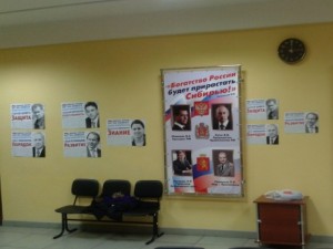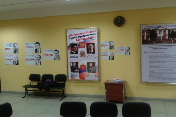 В холле красноярской гимназии №3 развешаны единоросские плакаты с изображениями лидеров избирательного списка.