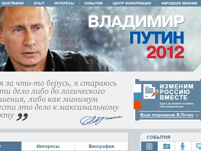 В интернете появился сайт кандидата в президенты России - Владимира Путина. Он доступен по адресуhttp://putin2012.ru/ На сайте, как и полагается, есть биография кандидата, представлены его фотографии и интересы, среди которых, как можно узнать, - самбо и дзюдо, горные лыжи, а также хоккей. На ресурсе представлены и некоторые тезисы избирательной программы. Но самое главное: на сайте можно оставлять пожелания претенденту на пост главы государства. Правда, для этого нужно в обязательном порядке указать свои личные данные, такие как фамилия, имя, отчество и телефон. И предложения уже появились. Как и в социальных сетях, здесь можно кликнуть "плюс" или "минус", что будет означать поддержку, либо неприятие предложения. А потом отсортировать по популярности. Результат - на скриншоте. Ну а дальше - наслаждаемся результатом и наблюдаем, как будет меняться ситуация на протяжении следующих дней.