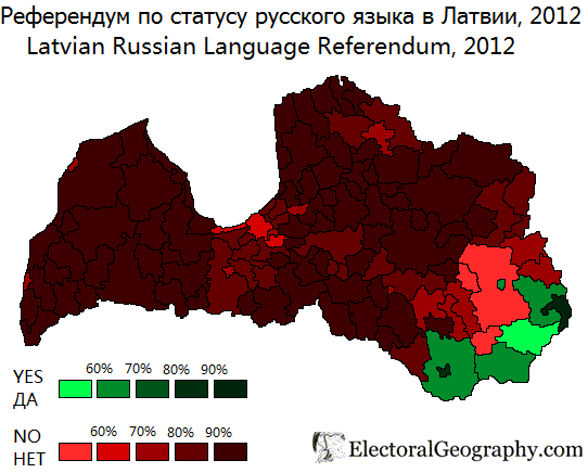 На референдуме о придании русскому языку статуса второго государственного 75% проголосовало против, и лишь 25% за. Разрыв больше, чем ожидался и по опросам и даже по проценту русскоязычных на выборах: 30% или почти 30%. Тут я вижу две причины. Во-первых, латыши были более активно против, чем русские за. Судя по географии явки, она у латышей просто была выше - смотрите карту явки